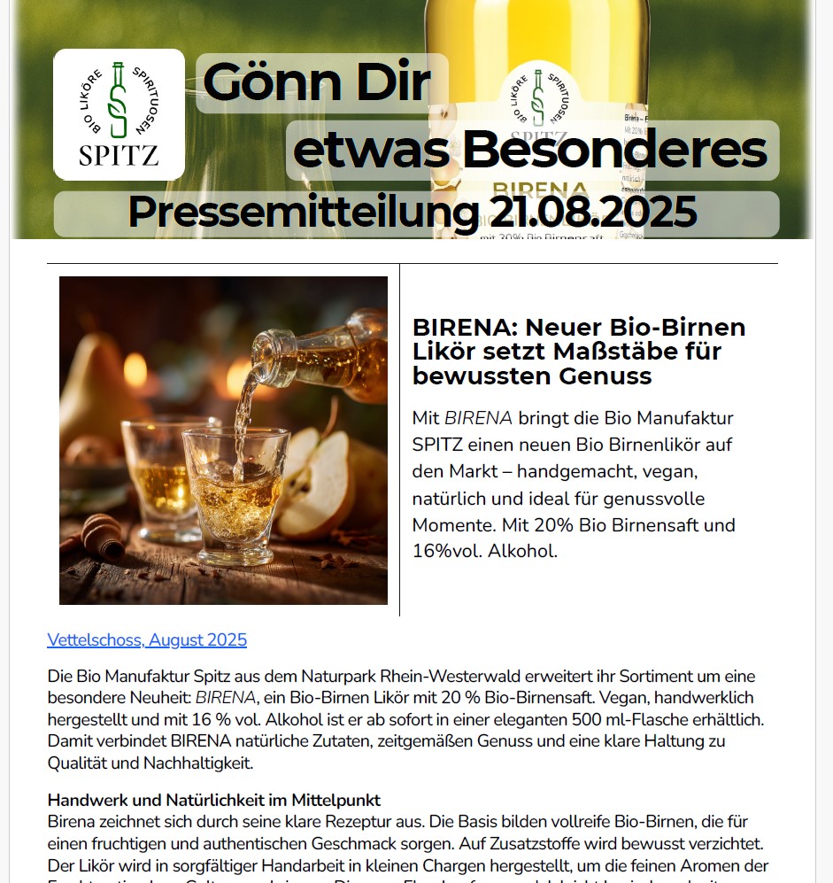 Mit BIRENA bringt die Bio Manufaktur SPITZ einen neuen Bio Birnenlikör auf den Markt – handgemacht, vegan, natürlich und ideal für genussvolle Momente. Mit 20% Bio Birnensaft und 16%vol. Alkohol.