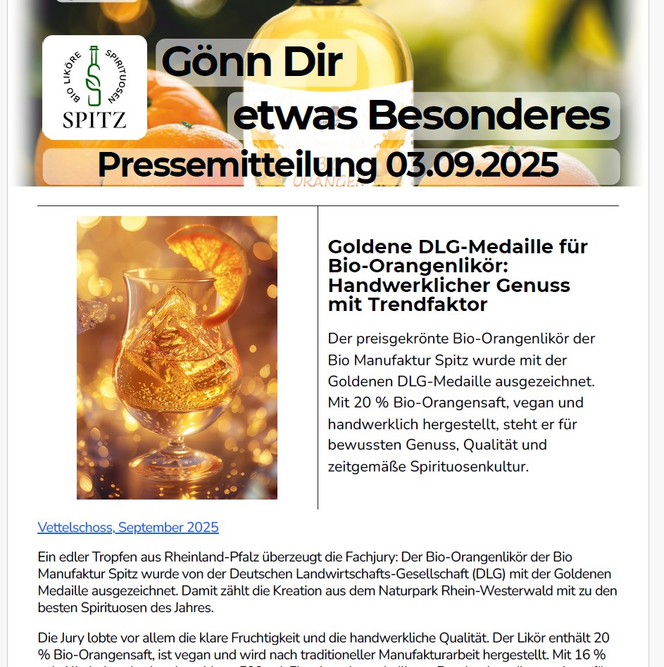 Der preisgekrönte Bio-Orangenlikör der Bio Manufaktur Spitz wurde mit der Goldenen DLG-Medaille ausgezeichnet. Mit 20 % Bio-Orangensaft, vegan und handwerklich hergestellt, steht er für bewussten Genuss, Qualität und zeitgemäße Spirituosenkultur.