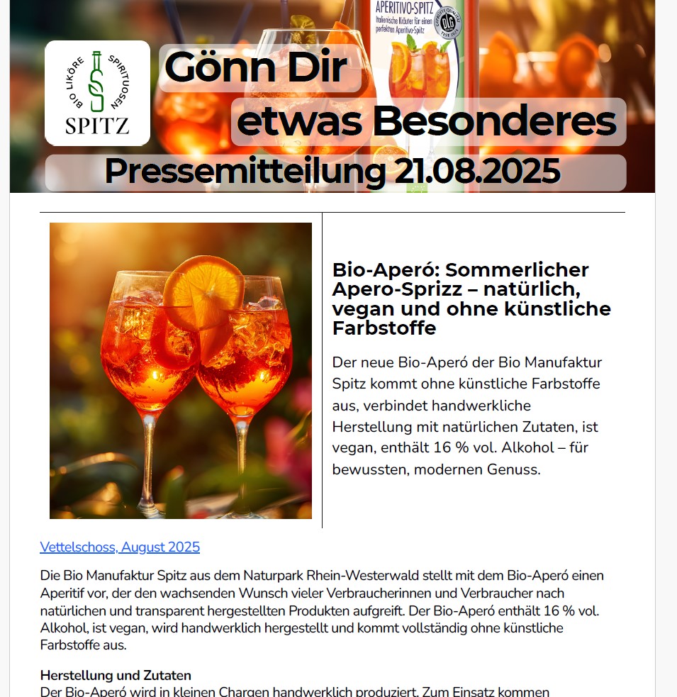 Der neue Bio-Aperó der Bio Manufaktur Spitz kommt ohne künstliche Farbstoffe aus, verbindet handwerkliche Herstellung mit natürlichen Zutaten, ist vegan, enthält 16 % vol. Alkohol – für bewussten, modernen Genuss.